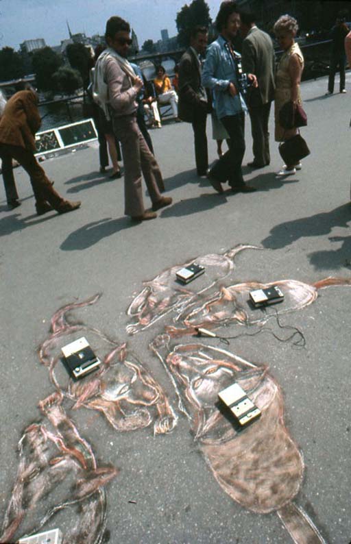 The image is from another piece, Chiens-Loups, as I was only able to locate a description of the works referenced above. But, according to Germano Celant (in Sound Art, edited by Peter Weibel, p. 154. Karlsruhe: ZKM, 2019), “a barking dog is recorded in pursuit of a man who is running away; Sarkis is both the barking dog and the running man”. This relates to my “Stray Jam” single where I am performing lead vocals as a dog.