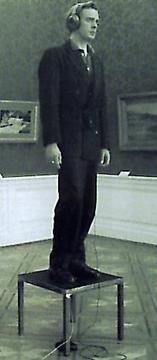 “…the visitor has to step onto a steel pedestal placed centrally in the exhibition space in order to be able to put on the headphones … becomes part of the work and as such is himself exhibited while observing” (Sonntag, http://www.medienkunstnetz.de/works/modern-minimal-disco/)