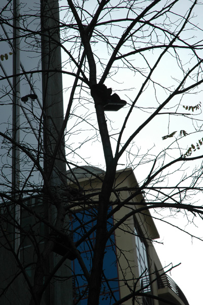 Speakers in trees emulating birds singing popular tunes.